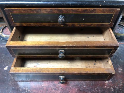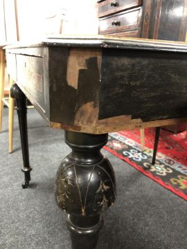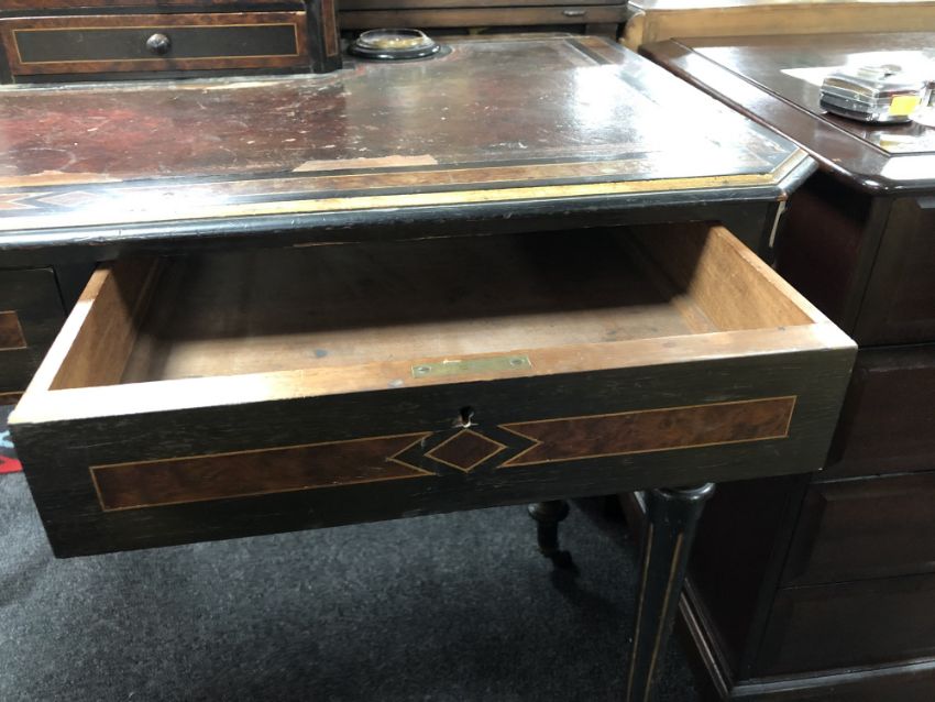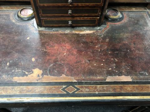 91cm wide by 50cm deep by 94cm high. Restorations needed throughout. Leather top poor with numerous losses and watermarks. Veneer losses throughout. Two inkwells with sections of wood broken off. Drawers on top are loose. Structurally very poor with a great deal of wobble in the joints. Does not sit level on all four legs. Castors original. See images.