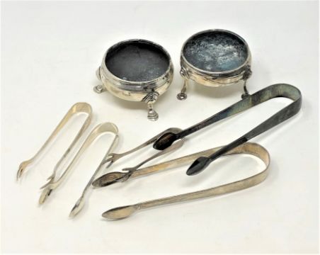 Two Georgian silver salts, three pairs of silver sugar tongs and two pairs of plated tongs (7)