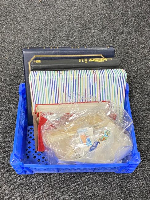 A basket of two albums and two files of 20th century stamps of the world together with a further bag of looks stamps