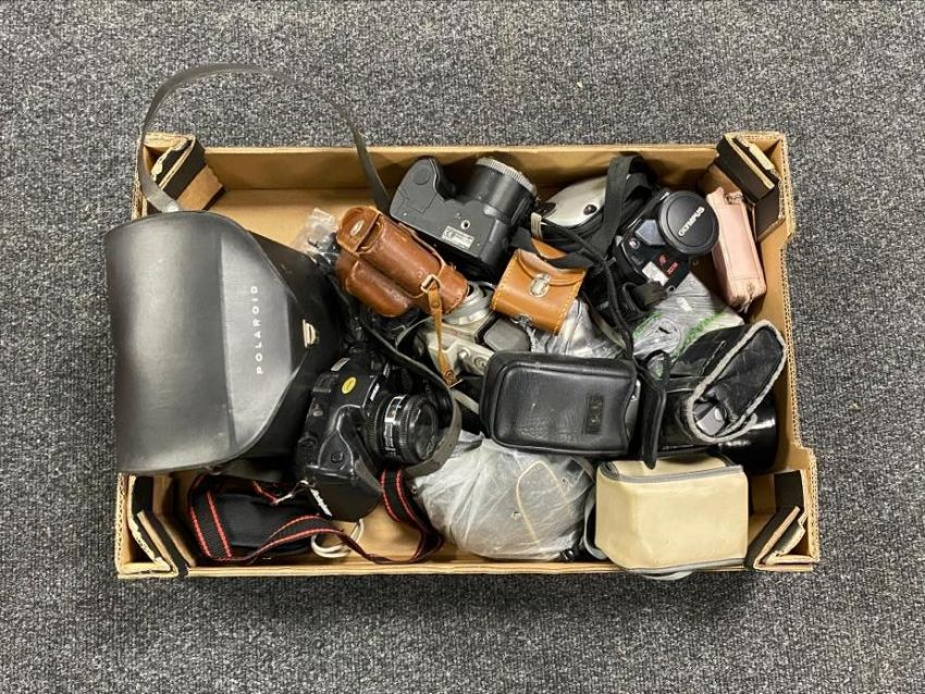 A box of vintage cameras Olympus, Canon, Minolta etc