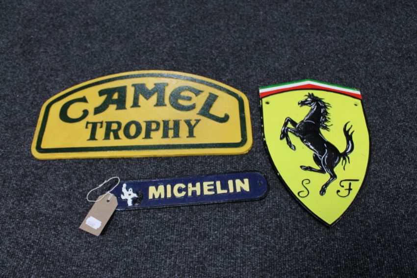 Three cast iron signs - Camel Trophy, Ferrari and Michelin
