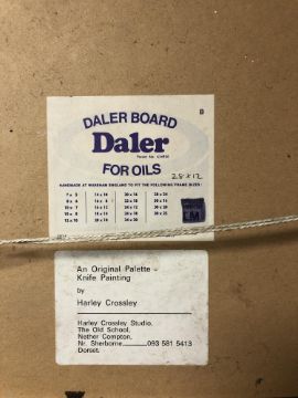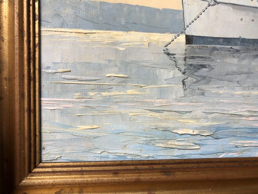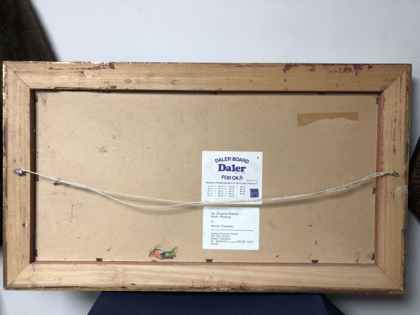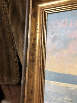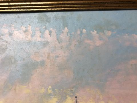 Canvas measures 60cm by 29cm. Staining to canvas, visible in the sky to the upper left. Some patches of paint flaked off in the same area, see close-up. Typical surface dirt throughout. Frame with watermarks.