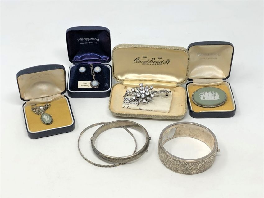 Three silver bangles, paste brooch, silver Wedgwood pendants, brooch and earrings (Qty)