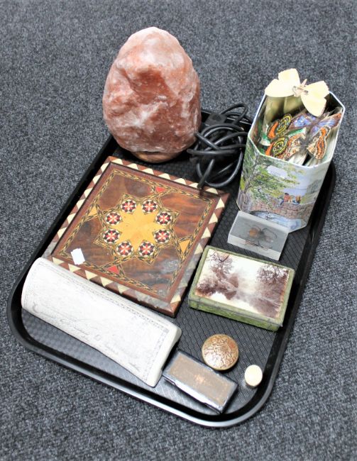 A tray of Rock salt table lamp, Tudor butterflies, Victorian trinket box, lacquered snuff box, marquetry tray etc