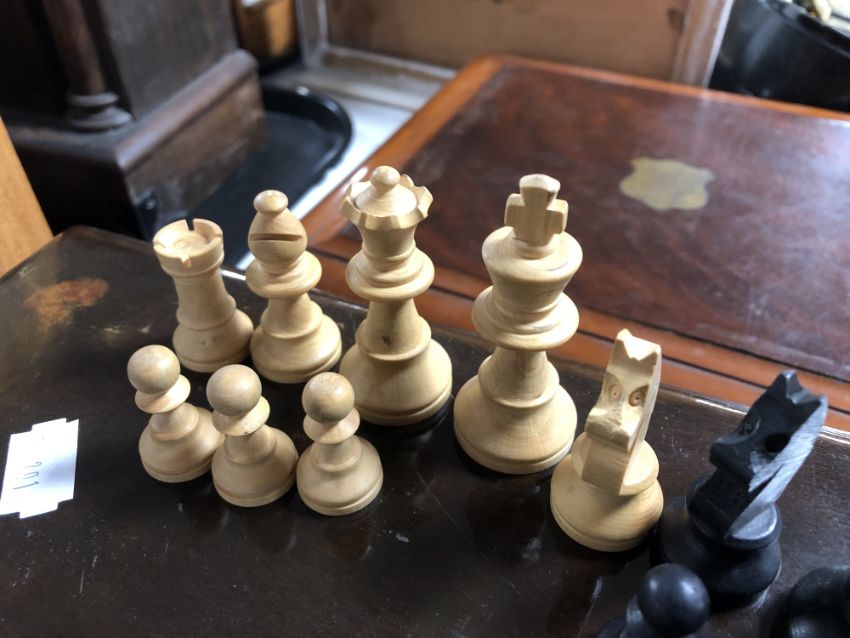 There are two chess sets. One is a modern plastic example and is missing a pawn. The other set is a modern turned wooden example, which is complete.
