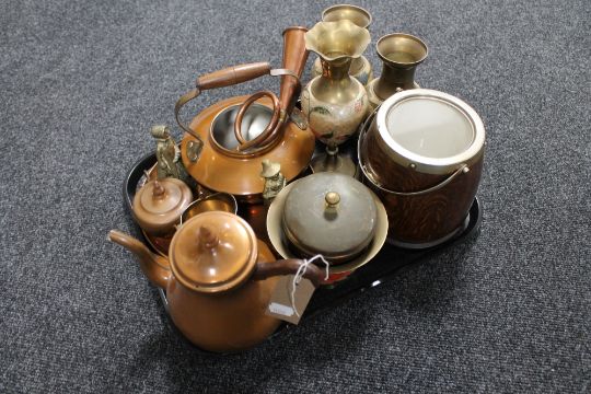 A tray of oak biscuit barrel, brass vases, copper tea service, copper and brass horn