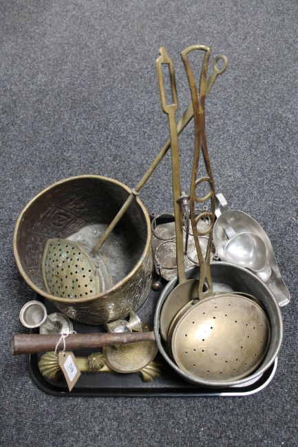 A tray of antique and later metal ware, copper iron handled pan, brass roasters, planters etc