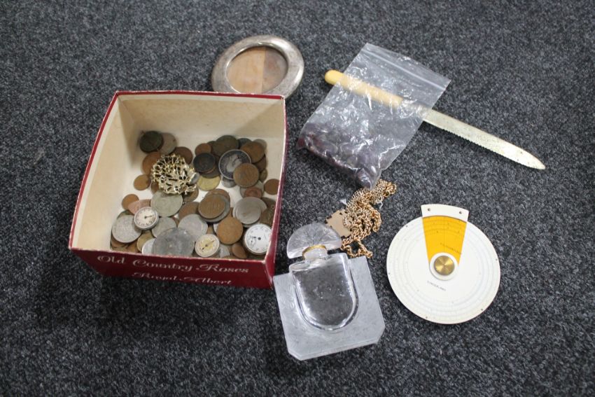 A box of silver photo frame, gilt watch chain, coins, blue john beads etc