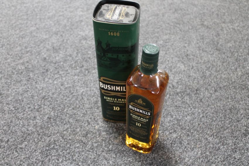 A bottle of Bushmills single malt Irish Whiskey aged 10 years, in presentation tube