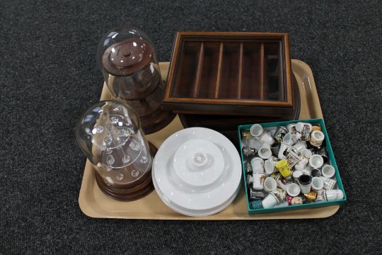 A tray of collection of china and metal thimbles, five thimble display cases and stands