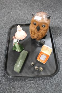 A tray of two Coalport ladies; Debutantes Beth and Your Special Day, carved wooden owl ornament, three plated monkey figures, Ronson lighter, Hohner Echo harmonica in case