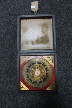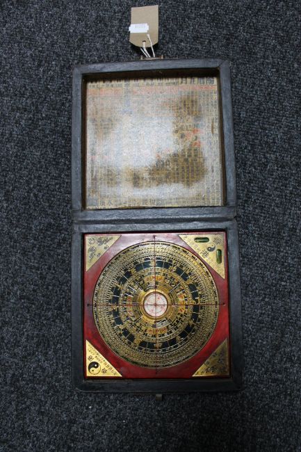 A 20'th Century Chinese compass ornately mounted inside a larger metal dial set within a square panel, in a metal-bound and lacquered case featuring dragon decoration, overall cased size 18 cm x 18 cm x 4 cm.