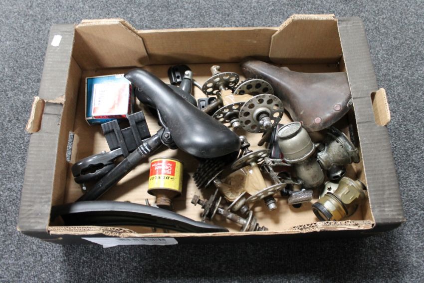 A box of vintage bicycle equipment to include Carbide lights, Brooks saddle, gear rings etc