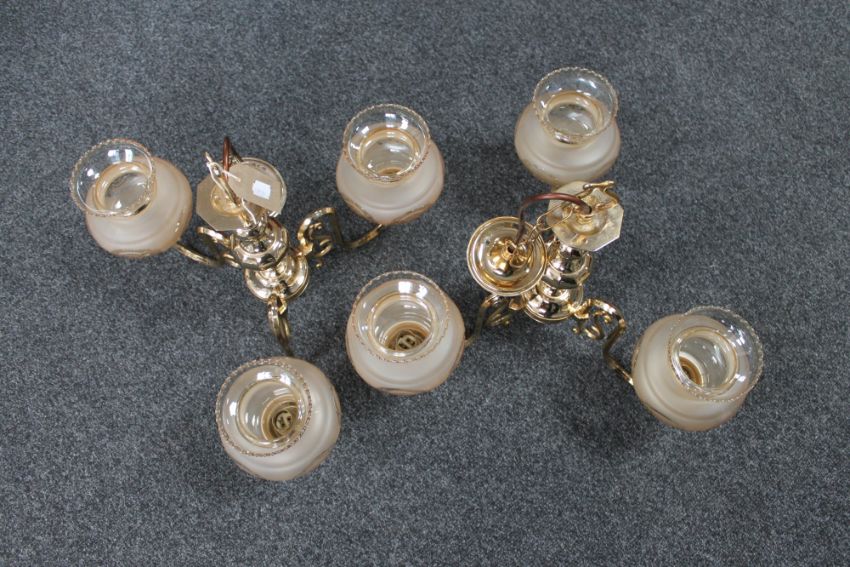 Two brass three way light fittings with glass shades