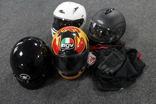 Four motorcycle helmets