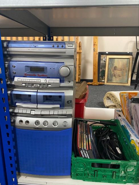 A Goodmans karaoke machine and a crate of karaoke CD's and microphones