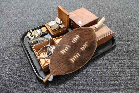 A tray of wooden boxes, bullet casings, cloisonne bowl, pill boxes, miniature Zulu style shield etc