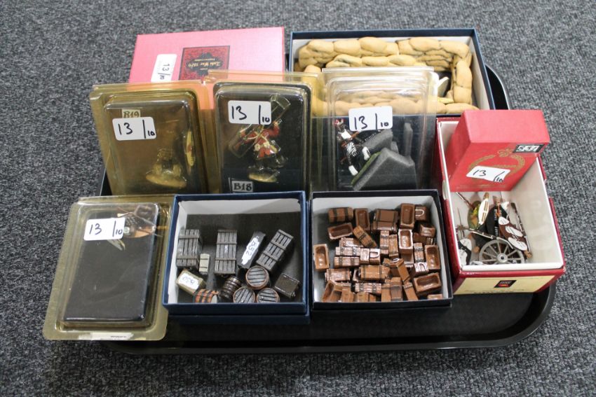 A Conte Collectibles Ltd. Zulu figure : Clump O'Zulus (4 Casualties), catalogue number 015, boxed, together with a Tradition model figure of a Zulu warrior, boxed, four further metal Zulu warrior figures in transparent plastic holders and four boxes of model accessories to include barrels, mealie bags, Zulu shields, rifles, crates, etc. (10)