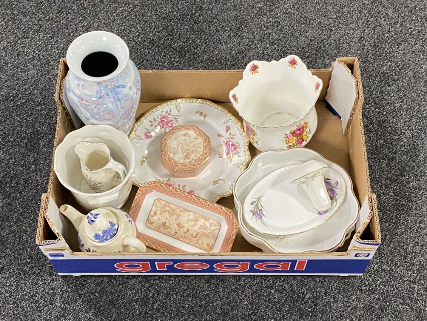 A box of assorted china to include Wedgwood Venus lidded trinket dish and tray, Chinese vase, planters, flan dishes, Hohner chromonica, glass dish