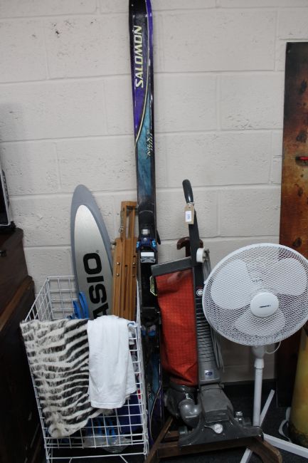 A Kirby Heritage upright vacuum cleaner, standing fan, pair of Salomon skis and basket of coat hangers, artist's easel, Casio shop sign etc