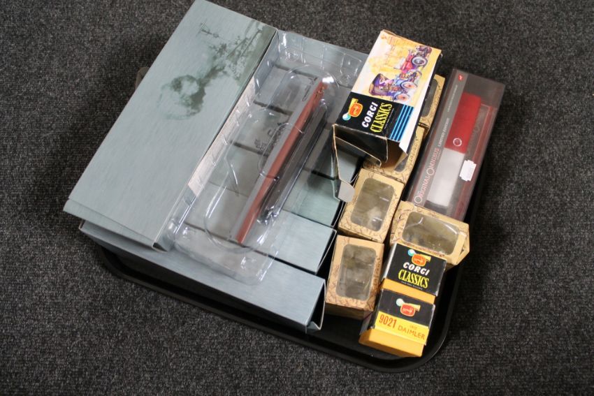 A tray of seven boxed Atlas Battleships, three Corgi Classics vehicles, Corgi Omnibus and five Lord of the Rings metal figures