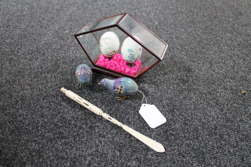 A pair of oriental cloisonne enamel bird figures, pair of painted eggs in display case, carved bone letter knife