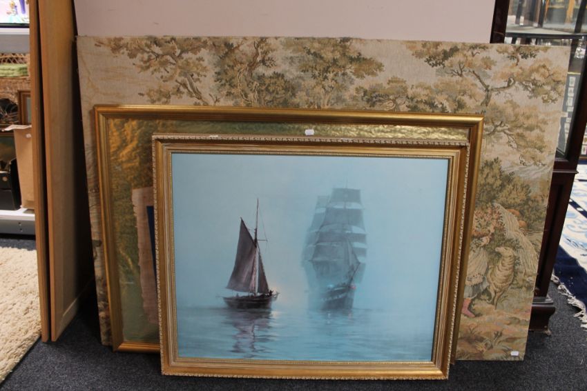 A gilt framed print of two ships, Van Gogh print, tapestry and a framed Egyptian print