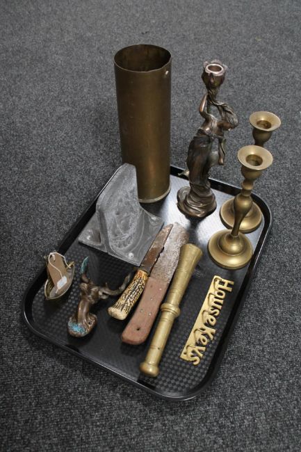 A tray of brass ammunition shell, brass candlesticks, pestle, bookends, bronze stag's head mascot etc