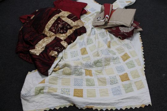 A box of hand stitched quilt and bed throw together with another box of curtains