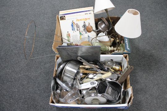 Two boxes of kitchen ware and utensils, lamps, records, metal watering can etc