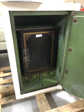 An antique painted safe with key, height 92.5 cm, with two internal drawers and strong box