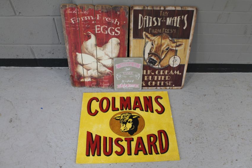 Four wooden signs "Colemans Mustard" "fresh farm eggs" "fresh farm diary" and "time for wine"
