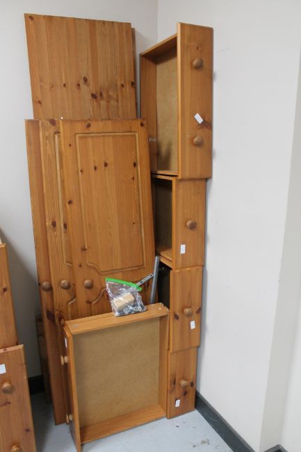 A pine triple door wardrobe with mirror door, fitted five drawers beneath (dismantled)