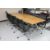 A twin section boardroom table in a walnut finish, length 320 cm, and a set of ten swivel armchairs upholstered in a mesh fabric on chrome bases
