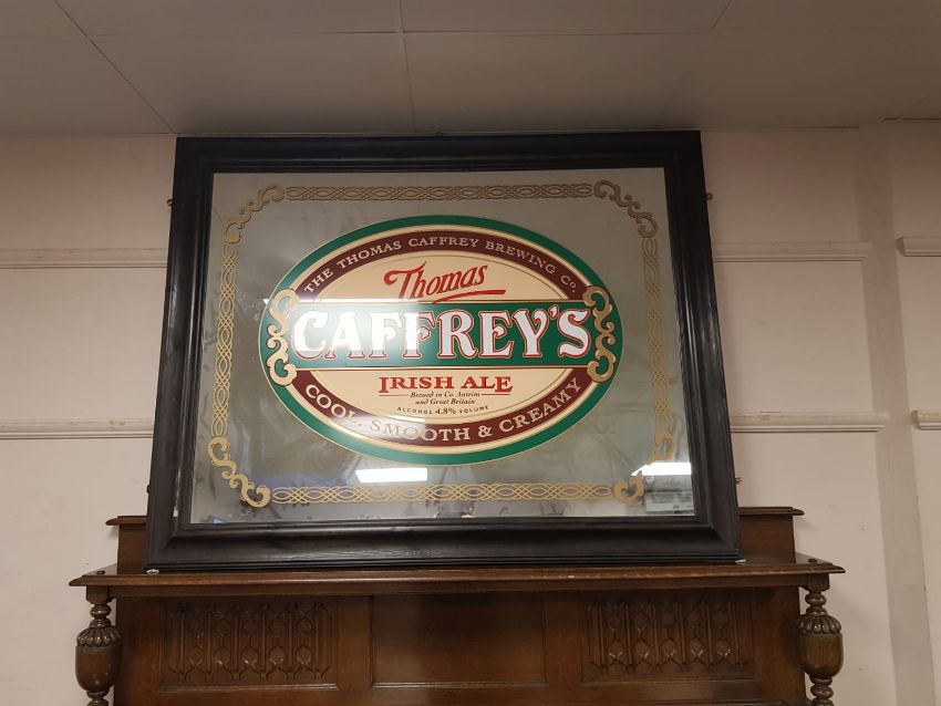 An antique and later overmantel mirror, with Thomas Caffrey's Irish Ale advertising, 130 cm x 103 cm
