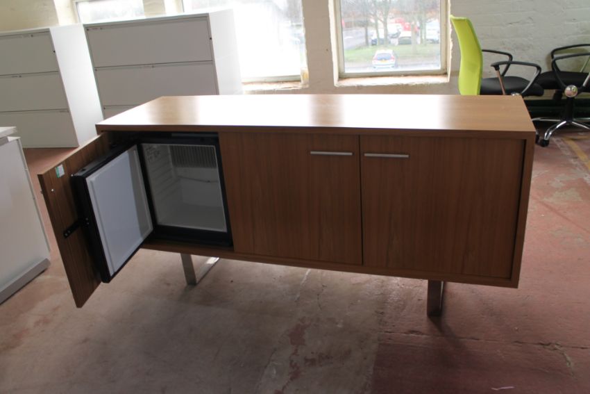 A three door walnut effect office sideboard containing a fridge (fridge door requires attention)