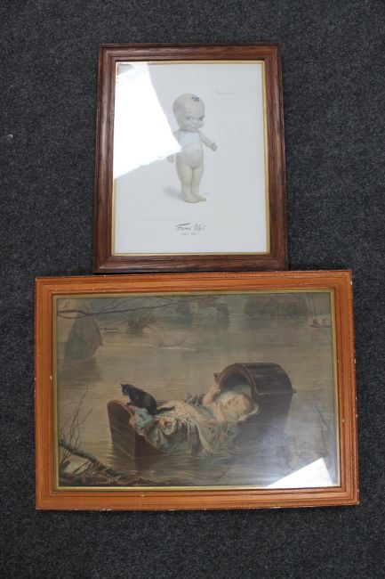 An early 20th century framed lithographic print depicting baby in crib together with a framed print