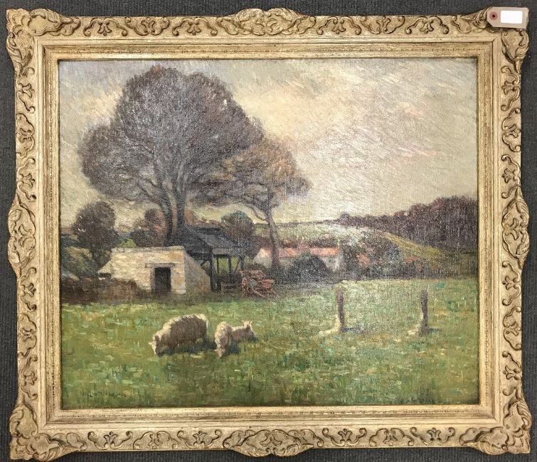Henry Herbert La Thangue R. A. (1859 - 1929) : Sheep grazing in a paddock, with a hay cart and farm buildings beyond, 62 cm by 75 cm.** Henry Herbert La Thangue was an English realist rural landscape painter associated with the Newlyn School.