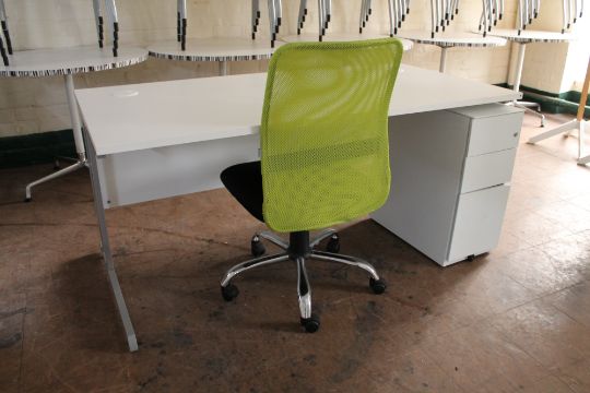 A rectangular office desk, length 160 cm with three drawer metal under desk chest and a two-tone Niceday metal fabric typist chair