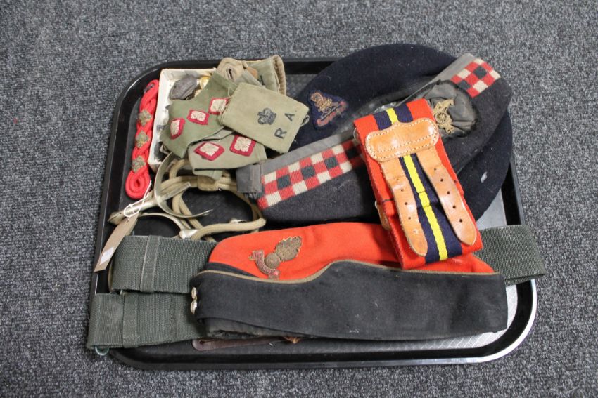 A tray of assorted military hats, belts, epaulets, buttons etc