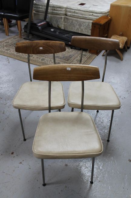 Three mid 20th century teak backed and metal framed dining chairs upholstered in cream vinyl
