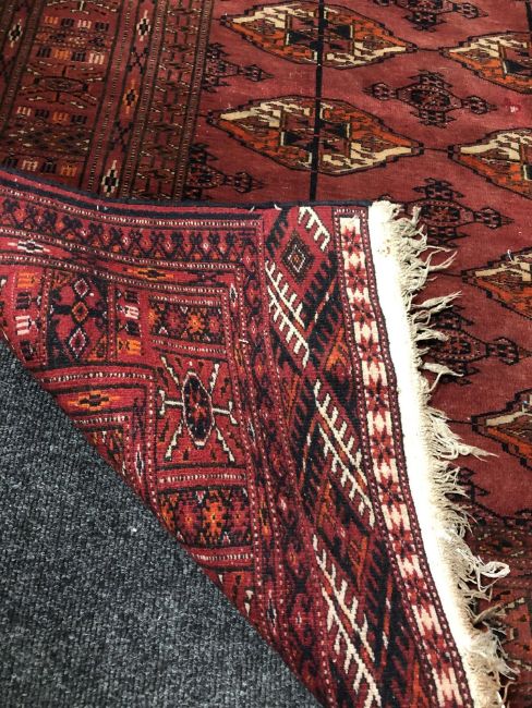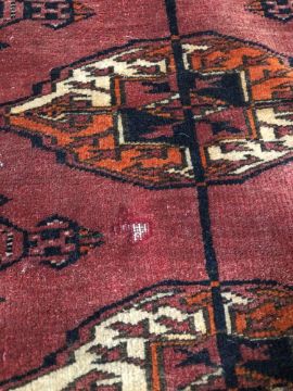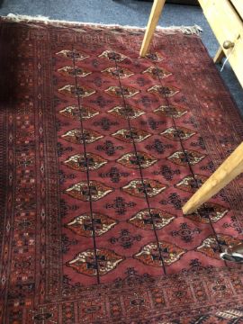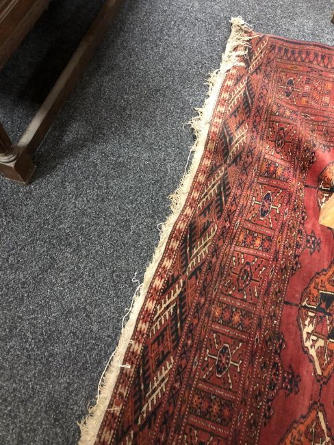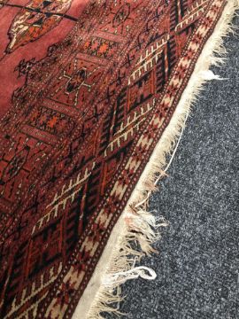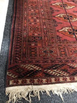 193cm by 143cm. Generally in good condition but with one small patch of wear to the pile in the centre. Selvedges intact but some fraying to each fringe. See images.