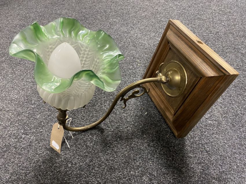 An antique brass-armed gas light fitting with green and opaque glass shade (converted)