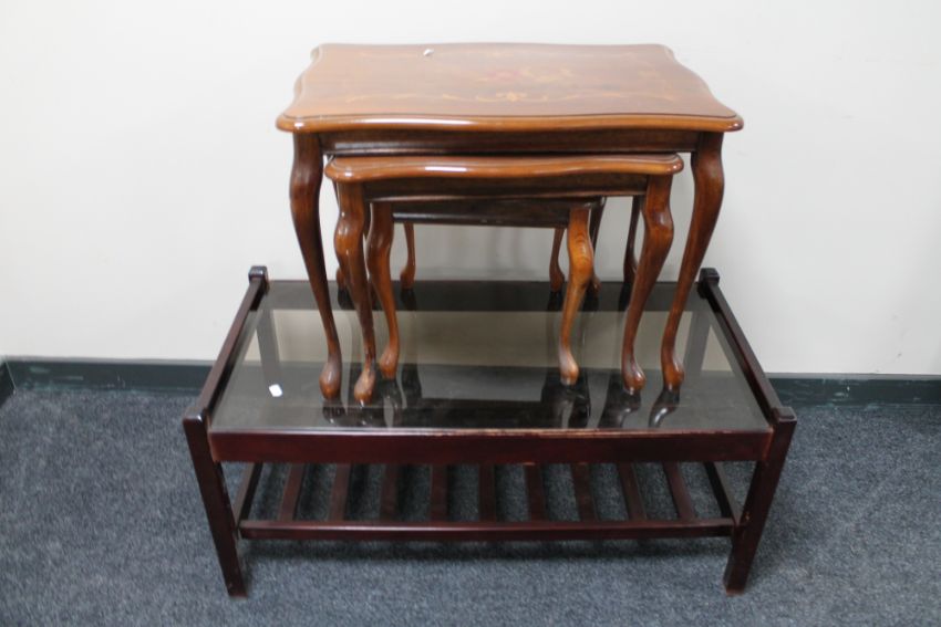 A nest of three Italianate style tables together with a two tier glass topped coffee table