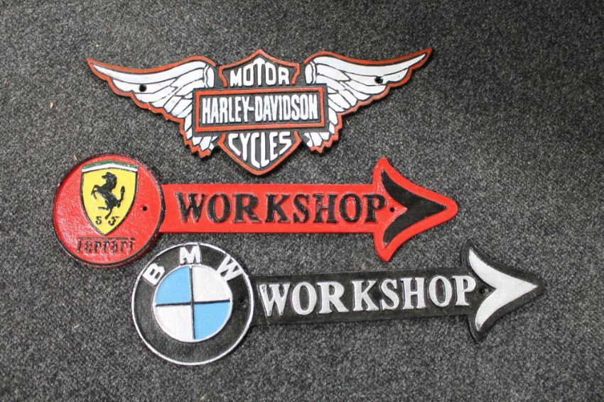 Three cast iron signs - Harley Davidson , Ferrari and BMW workshop