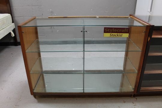 A twin section shop haberdashery-type display cabinet fitted with trays and a further 20th century shop display cabinet fitted with shelves (no glass doors)