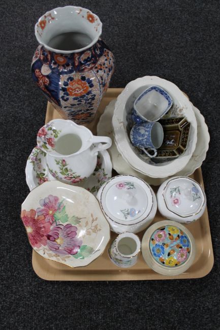 A tray of Japanese Imari vase, antique blue and white dish, trinket pots by Aynsley etc