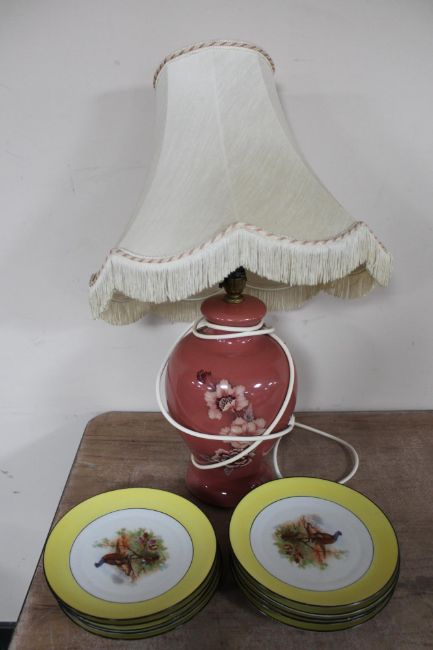 A set of ten china Bavarian plates depicting pheasants, Denby table lamp with shade