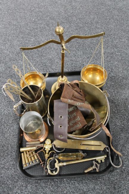 A tray of antique and later brass ware, balance scales, jam pan, spring balance, bullet casings, brass key and bottle openers
