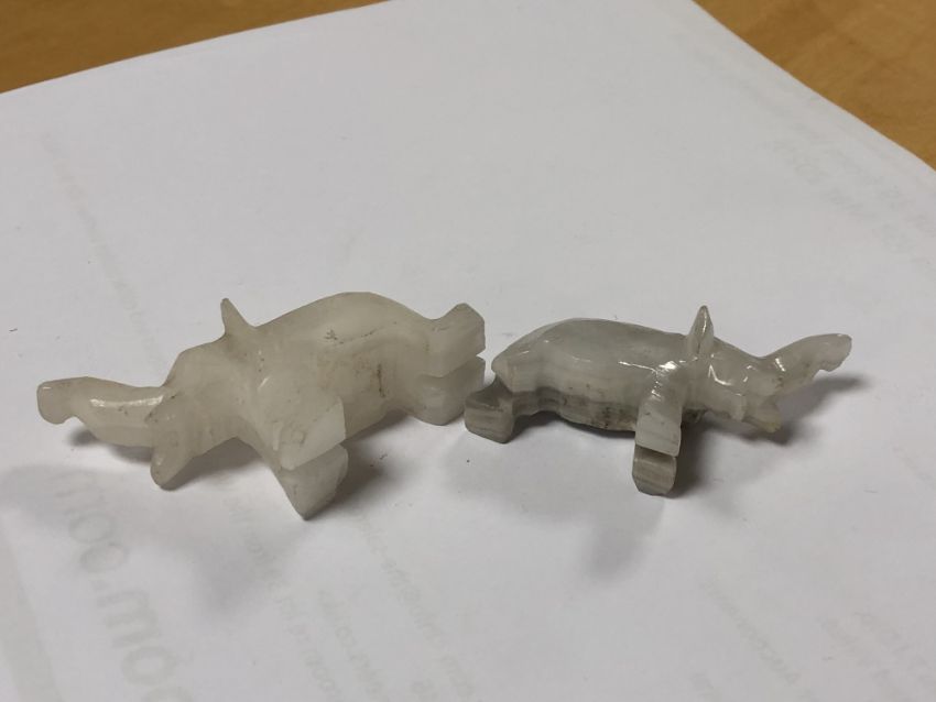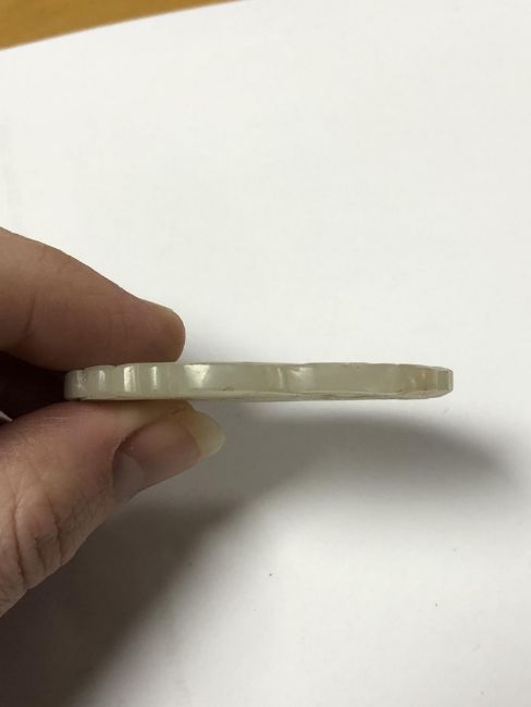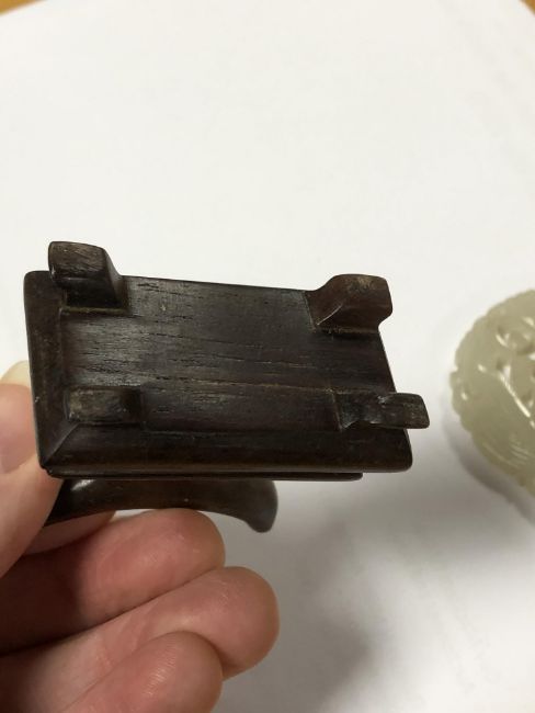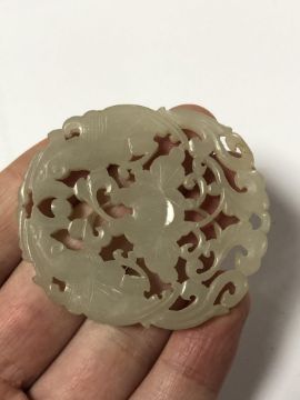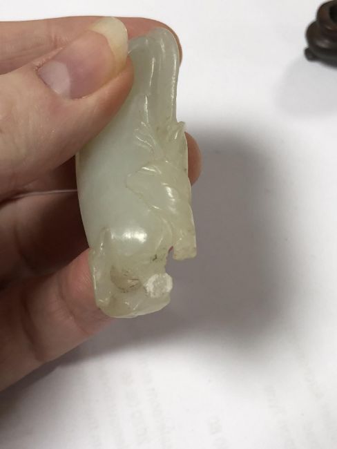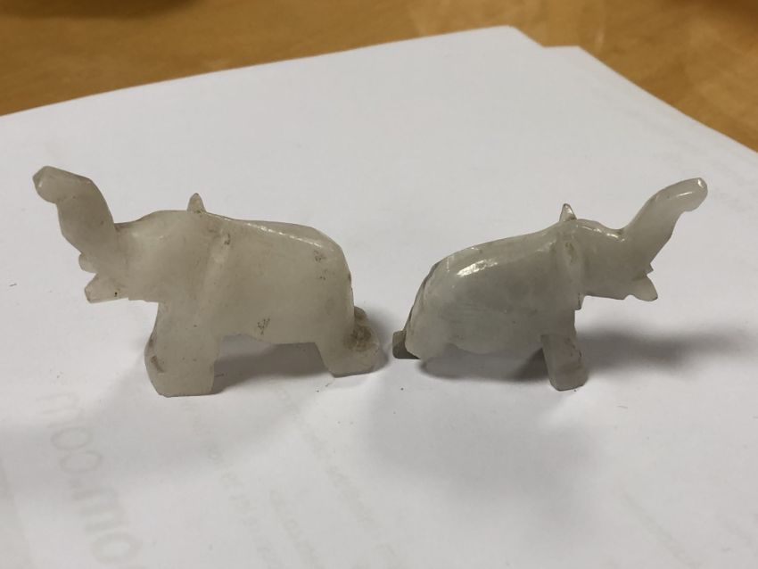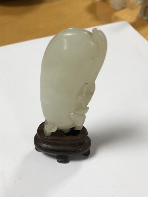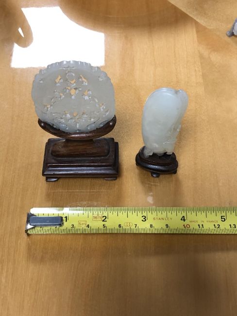 A Chinese jade carved disc on stand together with a further carved piece of jade on stand, two elephant figures and a leaf dish